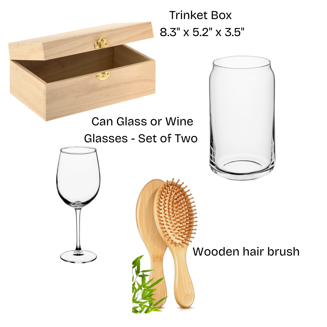 For our November craft, we’re swapping out the traditional canvas for something a little more unique! Instead of painting on flat boards, you’ll get to bring your art to life on wooden trinket boxes, wooden hair brushes, and glassware.
